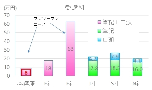 受講料の総額 (筆記+口頭)はできるだけコストダウンに努めています。しかも指導日数が長いので、一日あたりの費用は、何と600円以下ととてもお得です。なお、マーツーマン指導は、当社とF社だけです。これらデータの根拠についてお知りになりたい方はお問い合わせください。